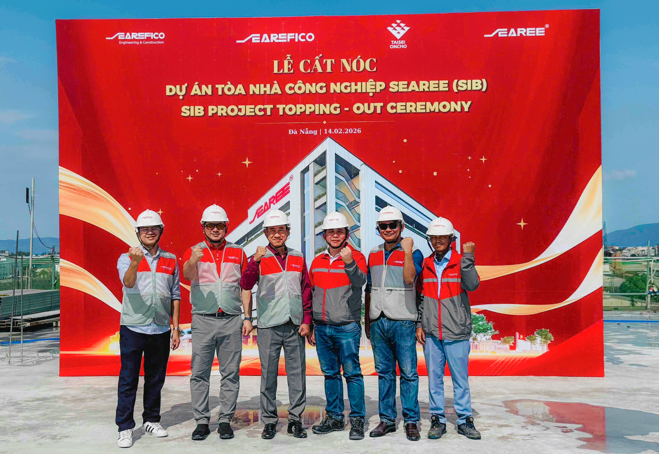 Dự án SIB đã hoàn tất công tác đổ bê tông sàn mái, chính thức kết thúc giai đoạn kết cấu khung chính vào ngày 14/02/2026 vừa qua. Buổi lễ cất nóc được tổ chức gọn gàng với sự tham dự của Ban Lãnh đạo Tập đoàn, nhà đầu tư Searee và đội ngũ Searefico E&C.