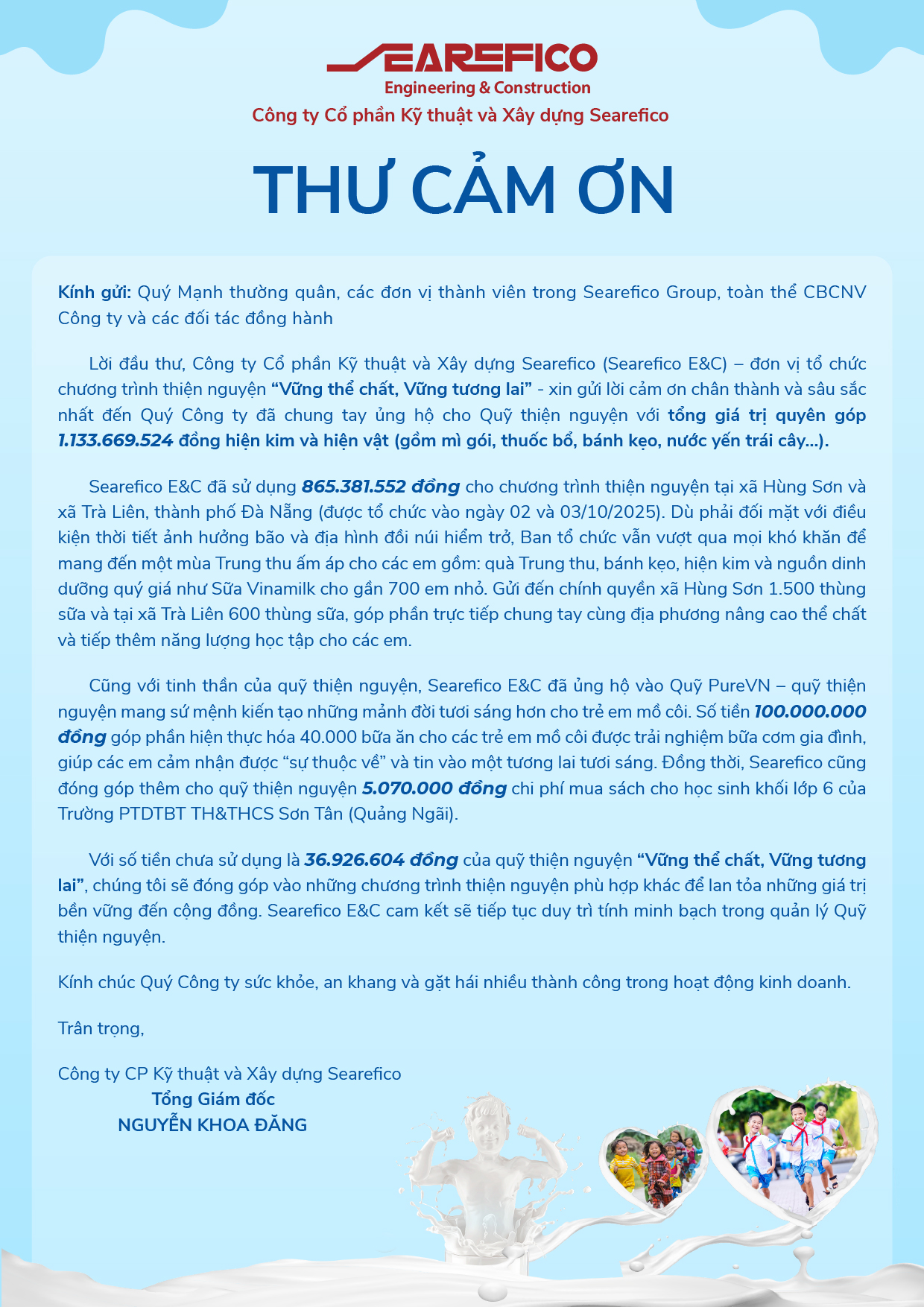 Searefico E&C xin chân thành cảm ơn sự tin tưởng và đóng góp của Quý vị. Với cam kết về tính minh bạch và trách nhiệm, chúng tôi xin công bố Thư cảm ơn có danh sách các địa điểm và đối tượng được trao quà. Việc công bố này nhằm đảm bảo toàn bộ các khoản đóng góp đã được chuyển đến đúng mục đích và đối tượng, giúp Quý vị có thông tin chi tiết nhất về hiệu quả của chương trình.